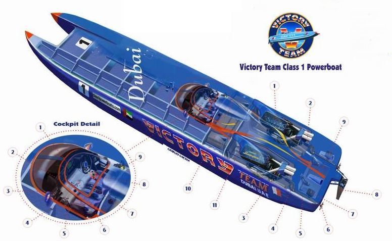 Hier seht Ihr einen Aufbau eines Class 1 Bootes, mit freundlicher Genehmigung des Victory Teams. In der Tabelle unten kann man einige Objekte anklicken und sie im Original als Foto sehen.