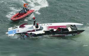 Zur Zeit noch ohne Punkte aber auch ein ganz heißer Anwärter auf das Podium ist das Qatar Team. Beim ersten Rennen zerlegte das Boot komplett und startete im zweiten mit dem Ersatzboot. Dieses hatte aber noch ein paar kleine technische Probleme und so hofft man nun wieder voll angreifen zu können. Erklärtes Ziel des Teams ist ein Platz auf dem Treppchen.